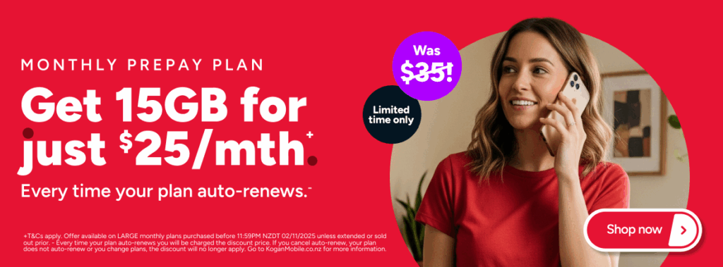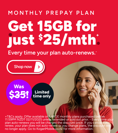 + Kogan Mobile’s LARGE 28% OFF Monthly Offer is valid for new and existing customers. Personal use only. New customer plans are set to auto-renew by default. Existing customers will need to purchase a discounted plan. After the first month, plans will automatically recharge at the discounted price and will continue to automatically renew on your renewal date at the discounted price for up to two years, provided that you remain on the plan and your plan continues to auto-renew on each subsequent renewal date. If you cancel auto-renew or your plan does not auto-renew (for example, due to insufficient funds) or you change plans, the discount will no longer apply. Offer available on Kogan Mobile prepay LARGE monthly plans purchased before 11:59PM NZDT 02/11/2025 unless sold out prior or extended. Not available for commercial or resale purposes. Vouchers expire at 11:59PM NZDT on 31/12/2025. Initial activation or recharge must be made before the voucher expiry date. Vouchers cannot be used in conjunction with any other promotional offers. Vouchers are not transferable for cash. A Kogan Mobile SIM card must be ordered from https://www.kogan.com/nz/ or https://www.dicksmith.co.nz/ before a Prepay Plan can be activated. SIM delivery takes up to 14 working days, after which you can activate.