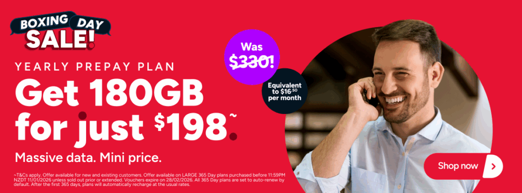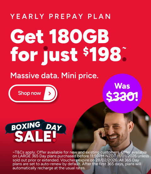 ~Kogan Mobile’s Boxing Day LARGE & EXTRA LARGE 365 Day offer is valid for new and existing Kogan Mobile customers. Personal use only. Existing customers will need to purchase a discounted plan. After 365 days, plans will automatically recharge at the regular price and will continue to automatically renew on your renewal date. You can cancel auto-renew at any time. Offer available on Kogan Mobile prepay LARGE & EXTRA LARGE 365 Day plans purchased before 11:59PM NZDT 11/01/2026 unless sold out prior or extended. Not available for commercial or resale purposes. Vouchers expire at 11:59PM NZDT on 28/02/2026. Activation or recharge must be made before the voucher expiry date. Only one voucher can be used per activation or recharge. Vouchers do not stack. Vouchers cannot be used in conjunction with any other promotional offers. Vouchers are not transferable for cash. The full amount of each Plan must be paid upon activation, recharge or purchase of a voucher. A Kogan Mobile SIM card must be ordered from https://www.kogan.com/nz/ before a Prepay Play can be activated. SIM delivery takes up to 14 working days, after which you can activate.